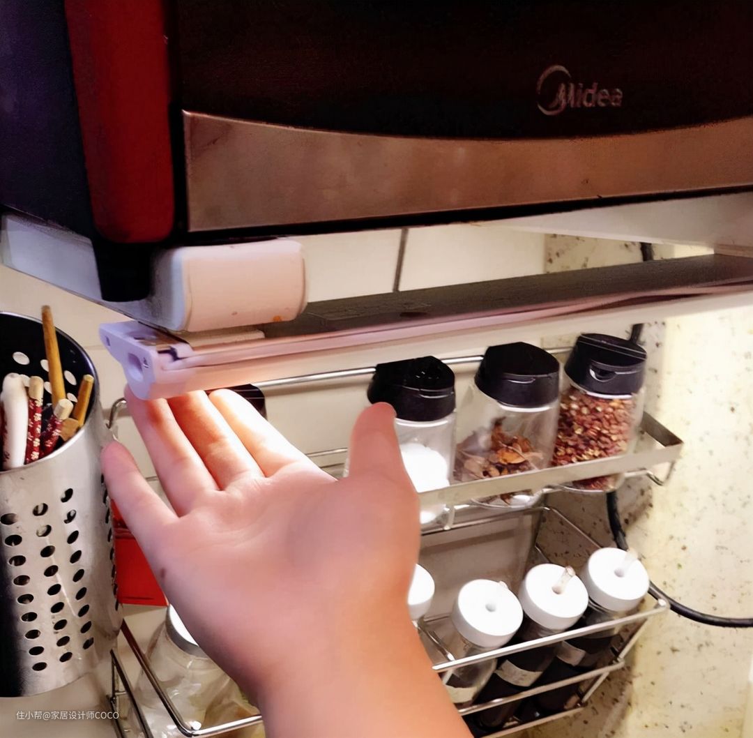 吊柜下安装灯带可以作为局部照明,工作区域就不昏暗,还让橱柜的颜值提高很多,由于以前没有预留灯带,所以选择感应式无线橱柜灯。
