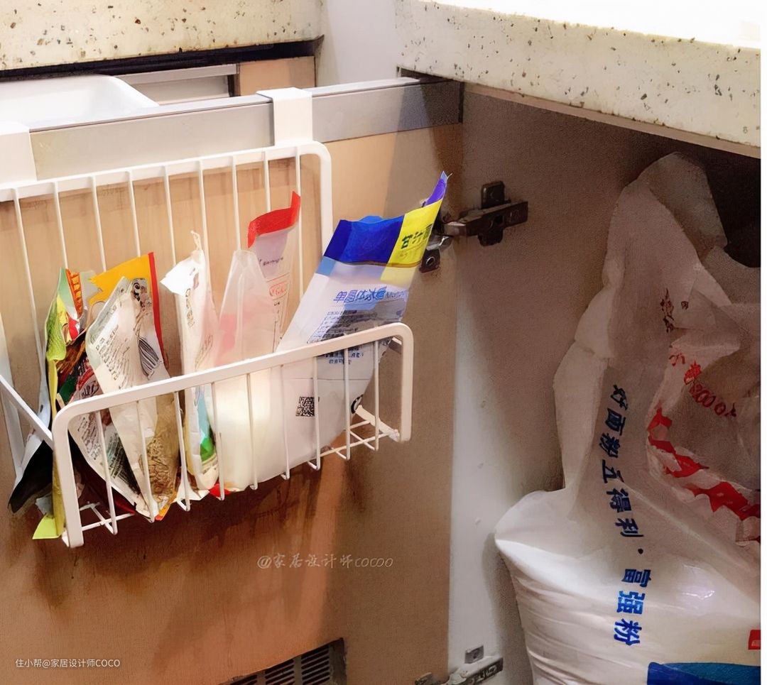 袋装的调料包,最容易让空间看起来杂乱,所以利用柜门安装了一个挂门挂篮,这样一些袋装的小调料包就有了专属用地。