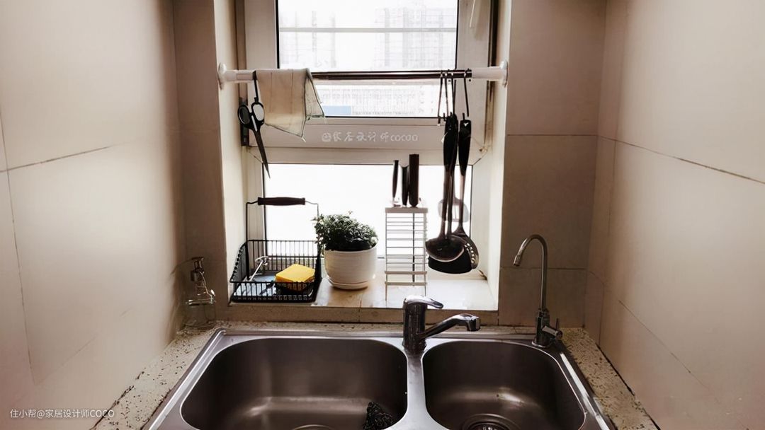17元一个包邮来的伸缩杆,利用窗台的空间做收纳,水池区域的台面也干净了许多,也方便了晾晒。