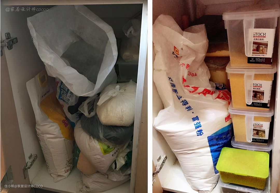 第二个地柜是用来储藏米面的,男主决定使用收纳盒来分类存放。