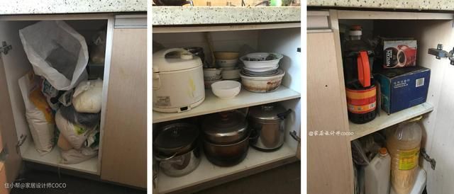 从左到右依次是厨房的三个地柜,只是简单地做了层板的设计,里面要放米面、碗盘、调料、杂物等,看起来非常凌乱,每次找东西都要翻一遍。