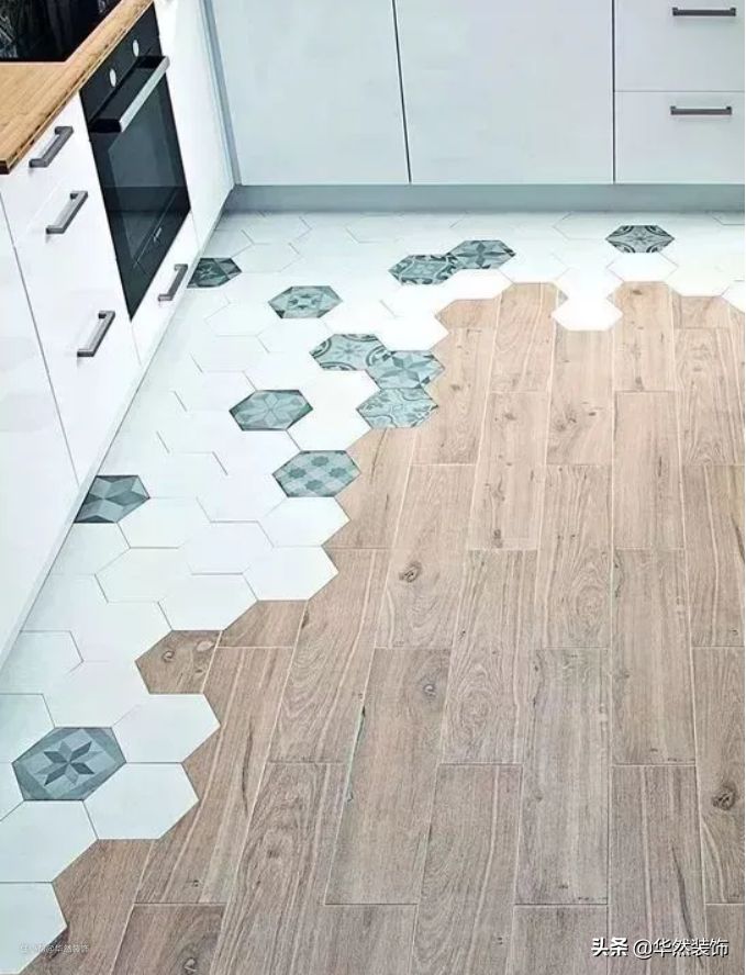混合型铺法一般把地板和瓷砖、水泥等地面材料,通过一定搭配设计进行混搭铺设。这种方式比较前卫,一般用来区域划分或增加趣味和艺术感。