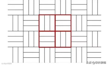 田字形的铺贴方法就是将几块同样长度的长方形木板,拼接成正方形,然后横竖更替,做成一个田字格的造型。田字铺法因像编织的花篮,故也被称为编织铺法。
