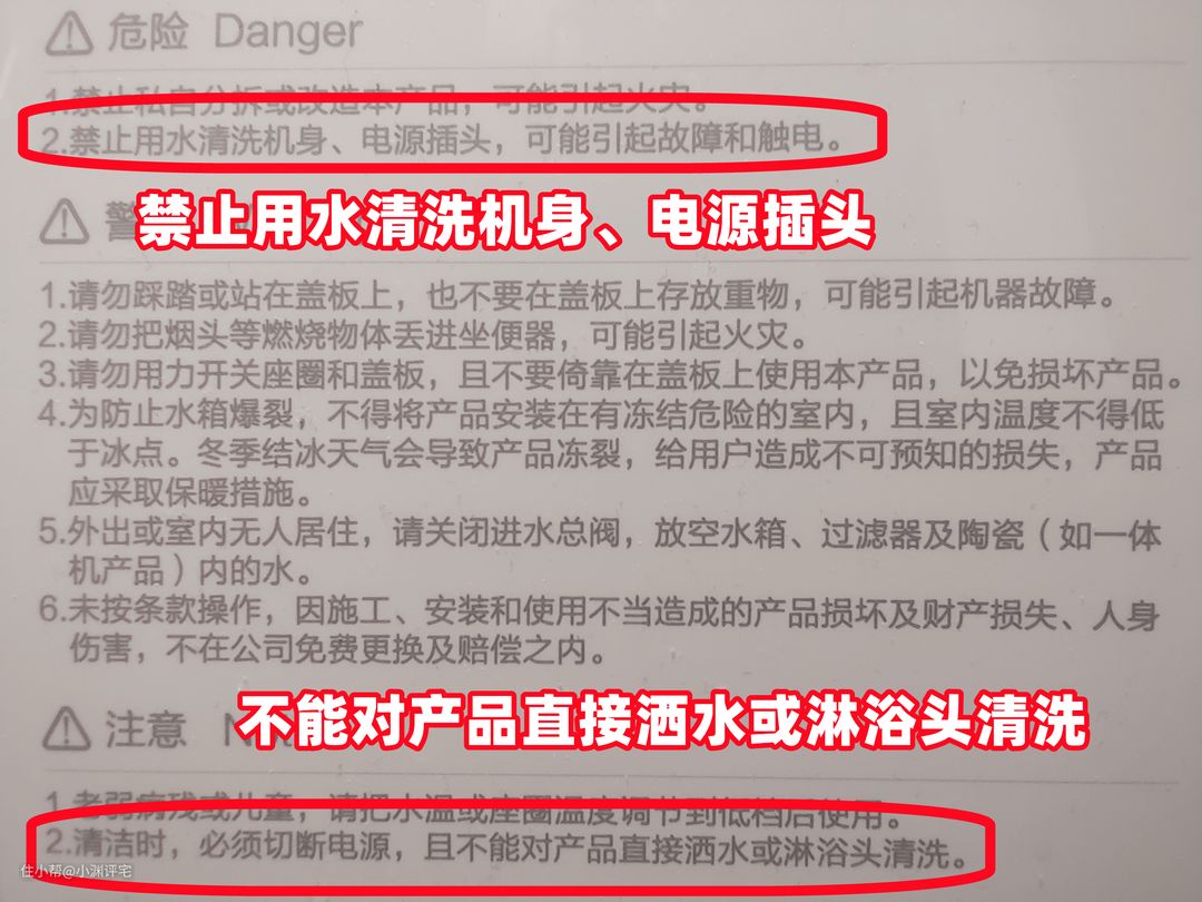 仔细看智能马桶盖上的警示标语:主机部分禁止接触水。