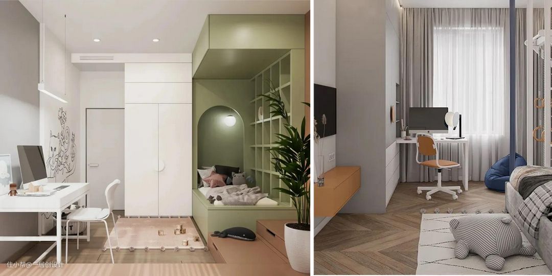 孩子长大了,中间以柜子的形式进行隔断,可以变成两个房间用,互不干扰,拥有各自的小天地,独立空间让更好学习以及管理自己