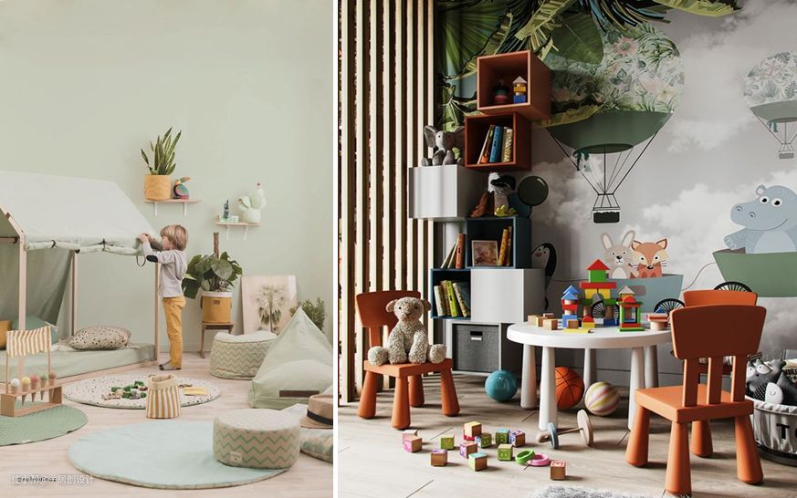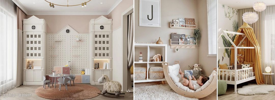 对于0-6岁的孩子,大多是和父母同住,独立居住儿童房的相对较少。儿童在这期间会不断地探索周围事物,通过日常生活环境培养行为习惯和个性。而配色一定要以简单干净为主。