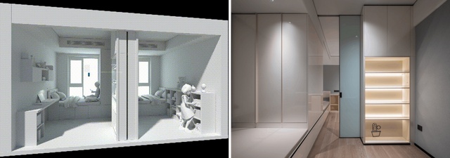 将房屋以幼儿时期到青年时期进行转换,在幼儿时期将中间隔墙打通,让空间更大化的展现形成宽敞的玩耍区域,促进两个孩子之间的相互沟通以及共同成长