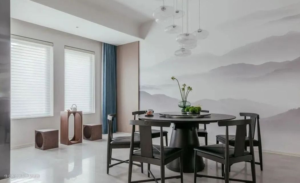 行云流水的背景墙壁纸,加上棕色木质的餐桌设计,飘逸的东方气质立马显现;温暖的阳光,精美的吊灯,变幻的光与影,通过简单的材质将东方的意境展现的淋漓尽致。