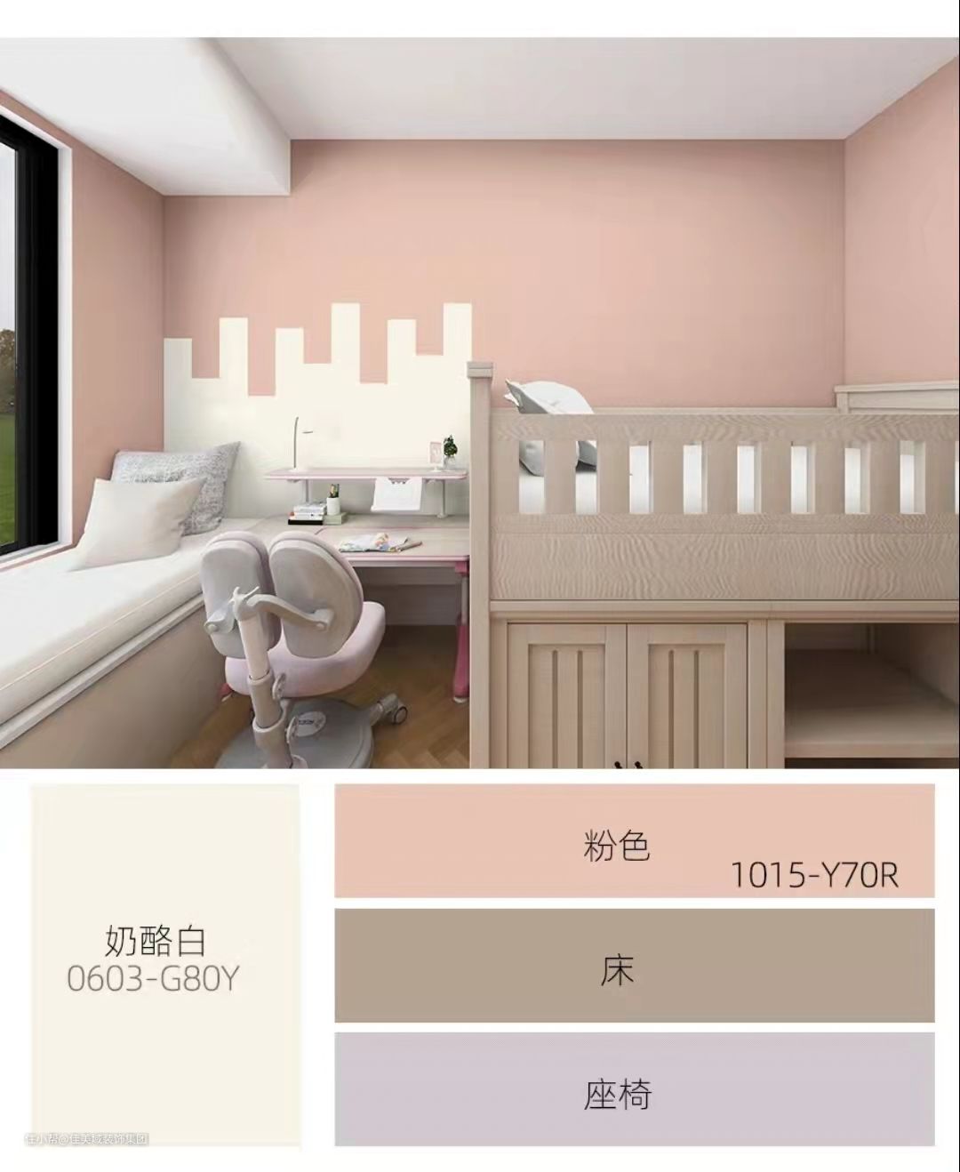 ✅少女感满满的蜜桃粉打造可爱温馨的女孩房,搭配米白色的拼色,高低错落有致,让墙面在造型上和色彩上都很丰富。