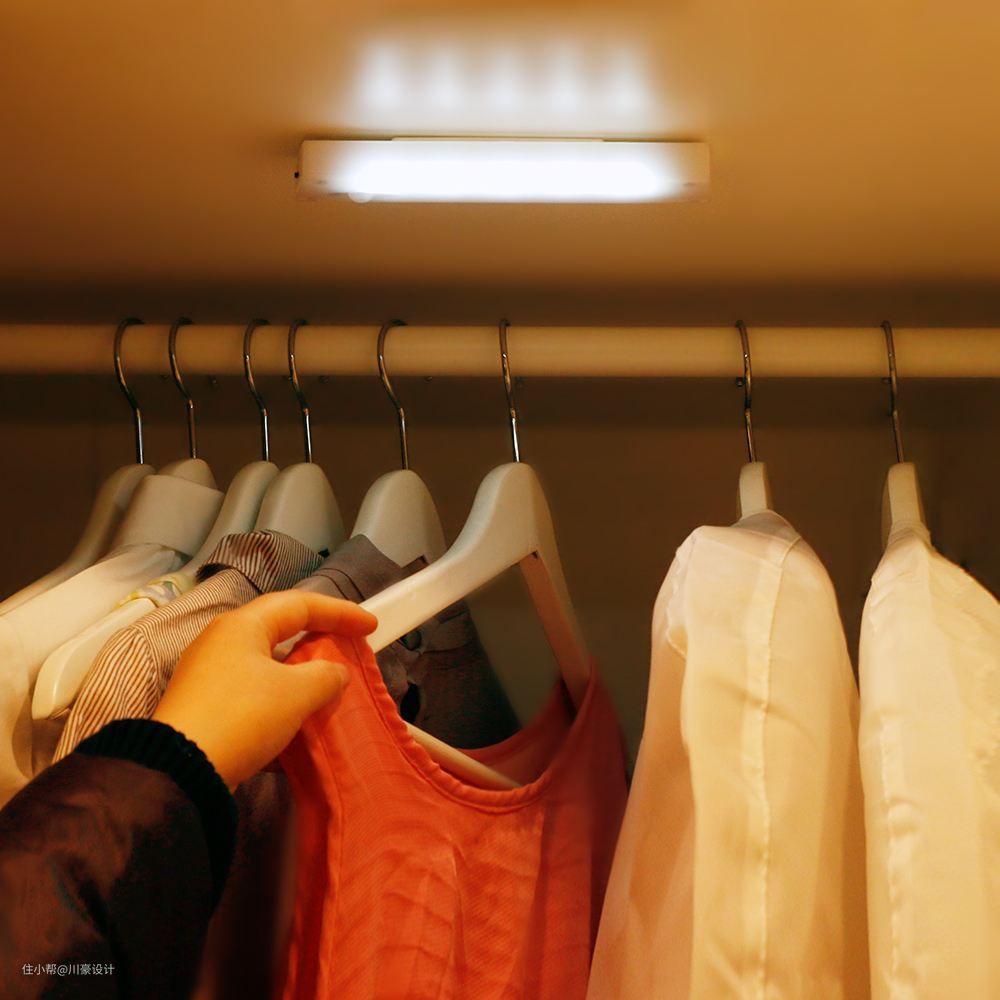 衣橱内部,适合使用发热较少的管状 LED 灯或筒灯,通过门的限动开关来控制照明灯具,也不会忘了关灯。还可以在层架设置灯带补充照明。