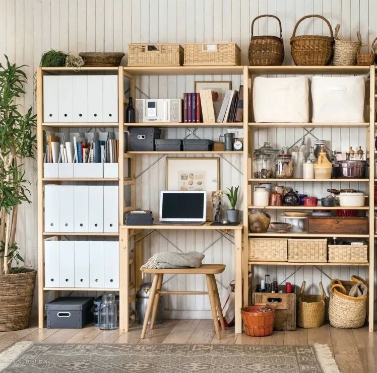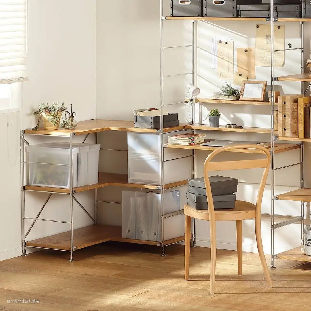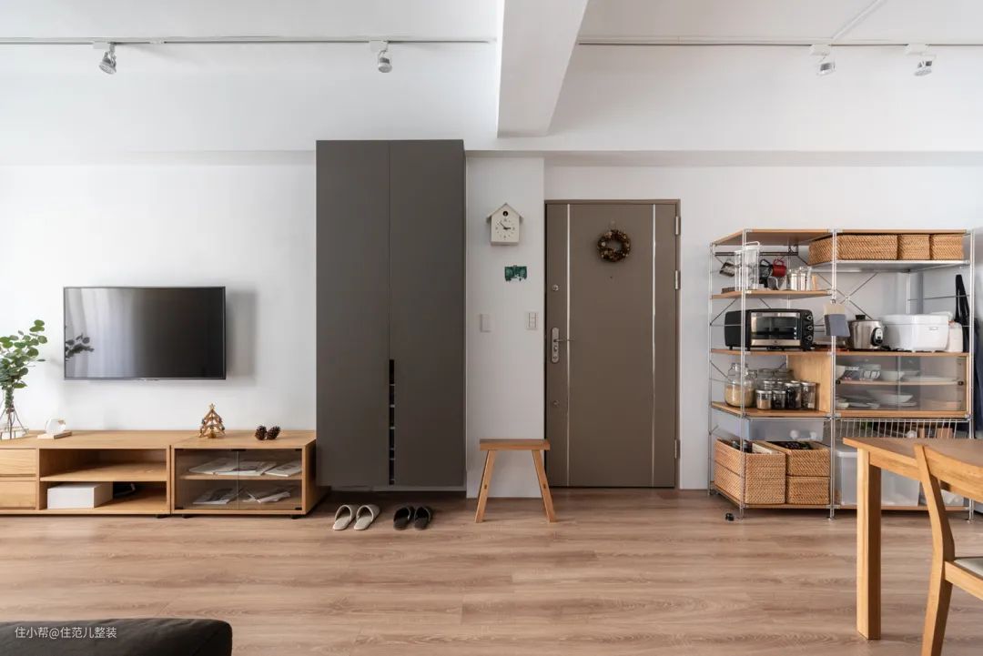 比起全屋的木作手工柜或者定制柜,越来越多的设计也将组合置物架融入全屋规划中,用置物架做柜体收纳。