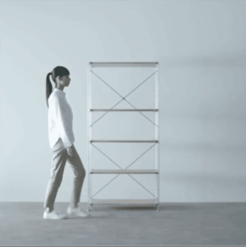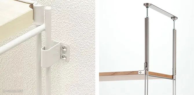 如果是比较大件的SUS层架,MUJI提供了两种固定方式,架子后面是墙的话,打上膨胀螺丝;如果没有墙,就用天花板固定配件来加固。