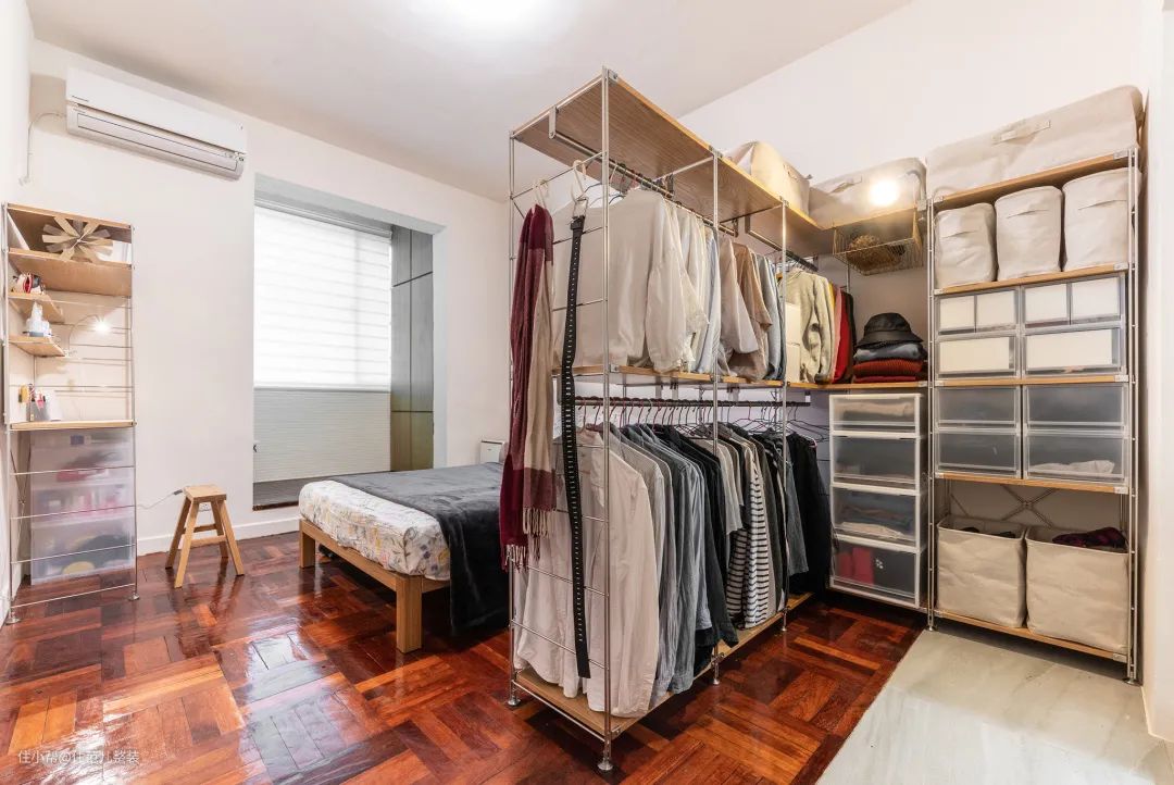 衣帽间也可以用组合置物架搭建,调节层板自由分割,与毛玻璃滑门配合,拉深了房间的视觉轻盈感,同时保证活动空间的整洁和衣物及日用品的清洁。