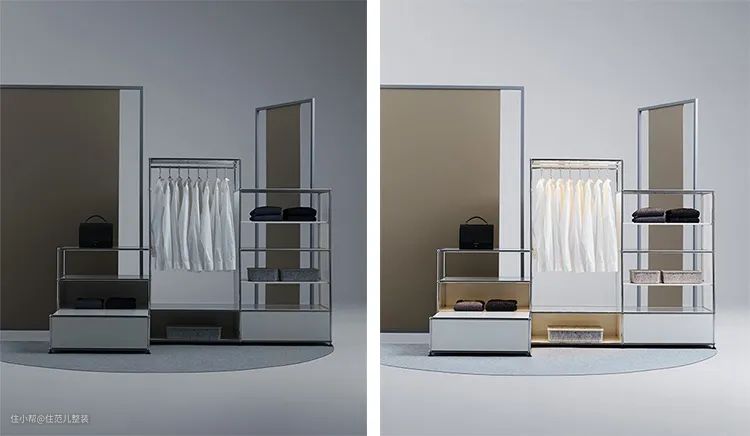 无侧板的设计视觉更通透,收纳的同时兼做空间隔断,两边拿取衣物都很方便,空间利用率瞬间提高。