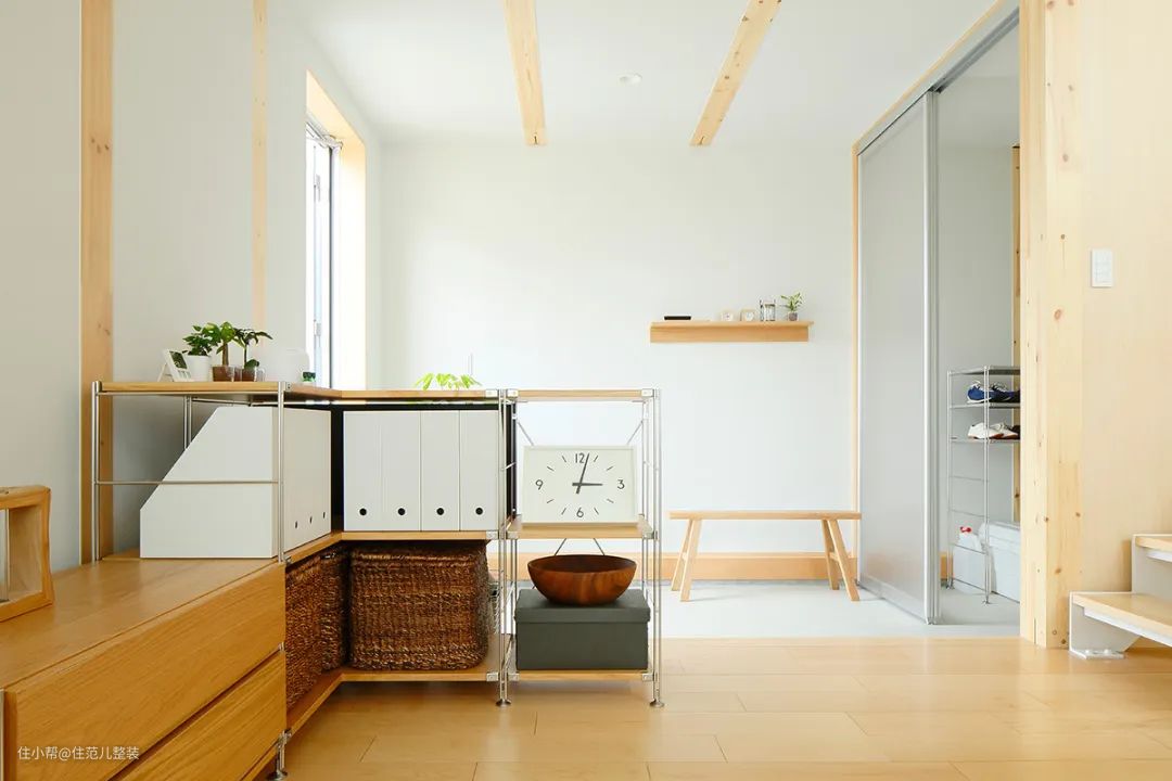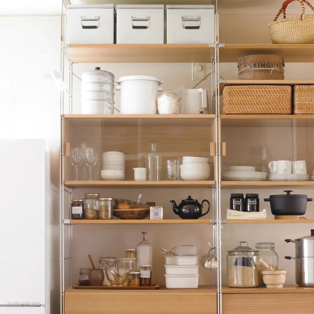 日本主妇家常用的是木质层板,橡木色和胡桃木色带着日式的小温馨,跟整个空间中的木地板和浅色家具搭配统一。