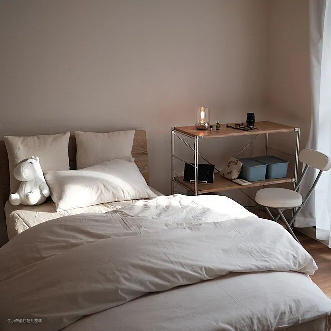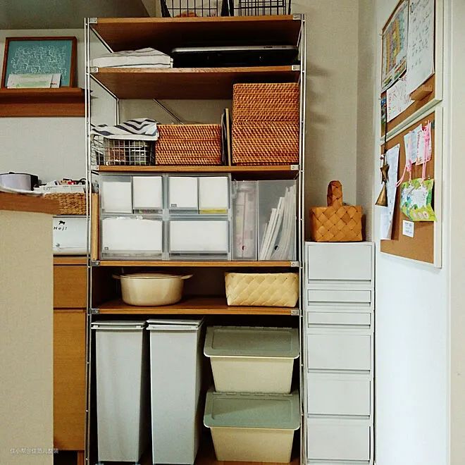 MUJI的收纳盒,无论是不锈钢收纳篮,还是聚乙烯收纳盒,和层架的尺寸都能吻合,相当好搭配使用。