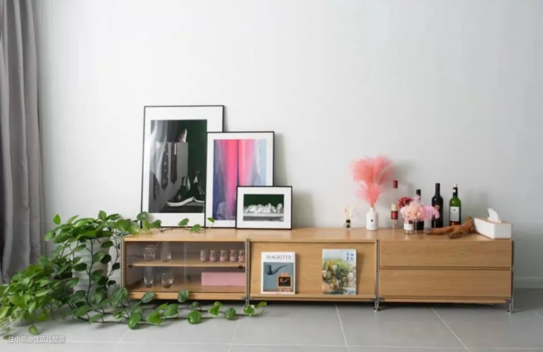 或者放在电视柜旁边加强储物,也是不错的选择,根据自己的生活习惯,和物品的使用频率,进行封闭式收纳和开放式收纳都很有必要。