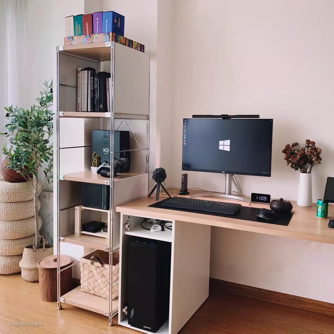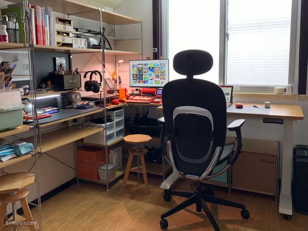 有专门的书房/工作室,一面墙全做成开放式,不固定的摆放和收纳,完全可以根据心情和需要随时改变。
