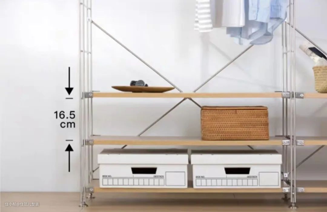 落地架、墙面架和配套的收纳组件都很齐全,层板的最小间距16.5cm,兼容大多数收纳盒的尺寸;5种架型的高度,适用于不同场景和户型。
