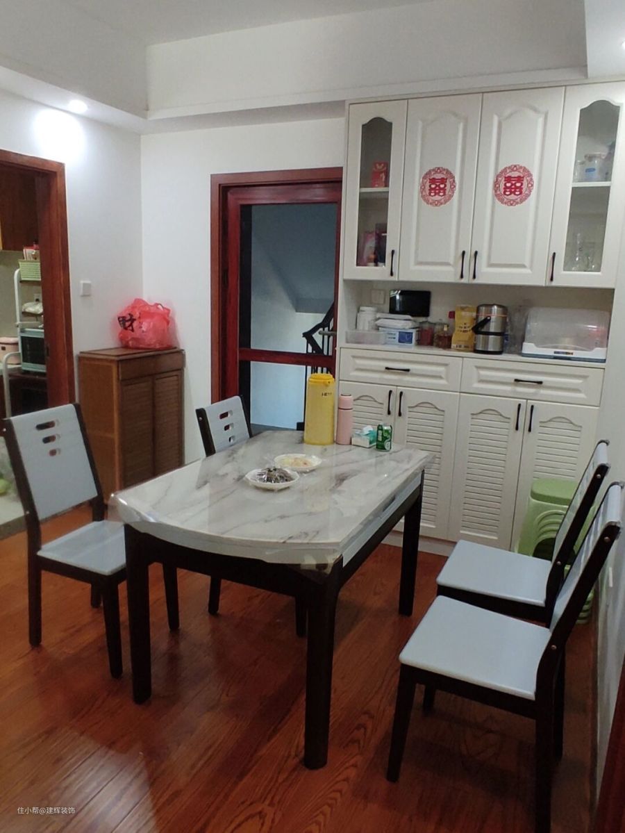 装修采用现代风格,我们现在看到的是餐厅区域,有一个可扩展的餐桌,可以根据人数灵活使用,特别棒。岩板的材料非常耐脏,实际上感觉像大理石。旁边定制了一个非常实用的白色餐边柜,分为上下两层,可以提供大量的储物空间。中间有个预留位置,可以放一些杯子等东西。需要用的时候非常方便!