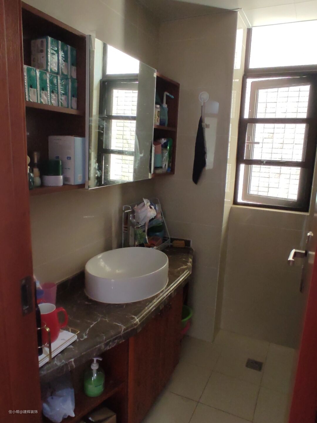 卫生间没有干湿分离,安装了柜镜,可以适当增加一些收纳空间,很多东西都可以方便收纳。而且台上的盆是装的,面值很高!