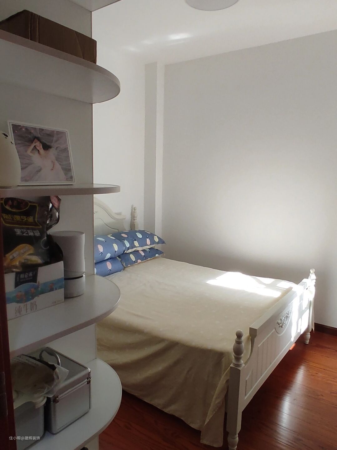 次卧其实兼并作为父母房,偶尔有家长过来一起住,就要准备一个房间。根据空间来看,床和衣柜布局合理,室内光线相当好。顶部安装吊顶没有选择,我更喜欢这种简单舒适的效果!利用这个小面积,布置了一个实木晾衣架,是落地式的,方便挂一些衣服帽子等。面值很高,网上直接购买的晒衣落地架很便宜很实用!这种实木衣架其实是放在家里的入口处。如果有足够的空间,非常实用!