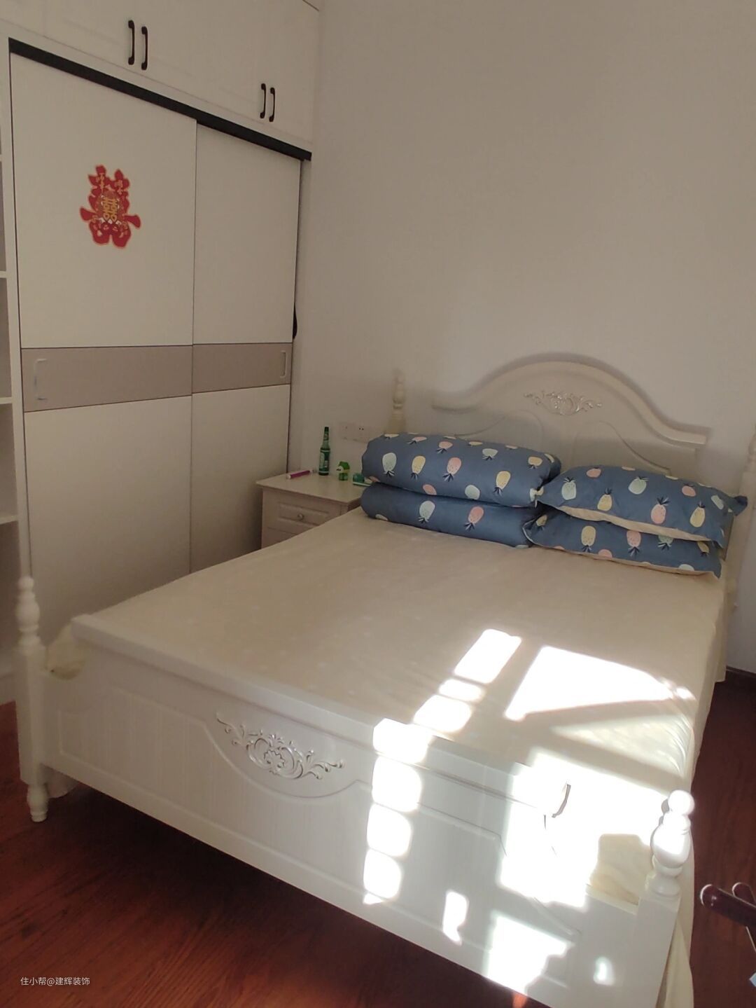 定制的白色衣柜直接上顶,还有一个梳妆台,非常方便女屋主使用,感觉很棒。每天起床整理四件套的床,感觉很舒服,心情也很好!
