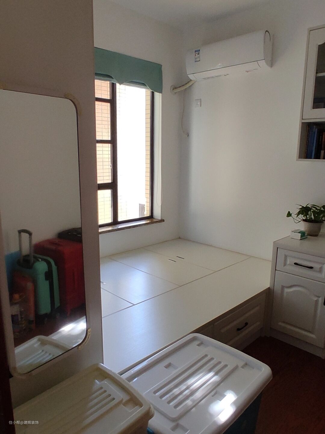 书房很小。考虑到室内空间的实用性,定制了非常实用的榻榻米。如果以后用作家里的儿童房,就没有影响了。定制榻榻米做工和质量都不差,细节处理的也不错。选择白色不会让人感到压抑。但是,作为一个杂物间,这个房间便于在家里存放一些其他的东西。