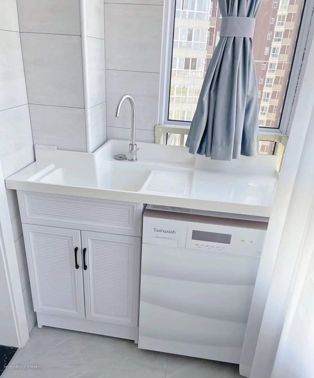 阳台左边设计为洗衣区,定制了洗衣柜,因为窗户的原因没有做吊柜,地柜定制时预留了洗衣机的尺寸,刚好合适,台面氛围放衣区、搓衣区和水池区,动线合理流畅,且非常实用。