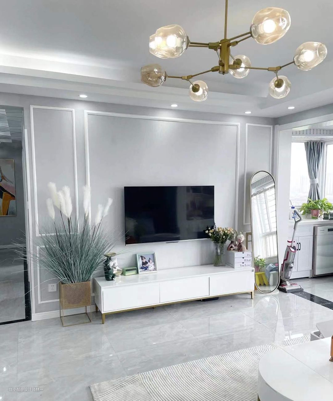 电视背景墙使用了石膏线条,边上是4公分,中间是6公分,高脚的电视柜更方便卫生地打理,一旁放置了造型别致的绿植,让客厅的氛围更加有活力与生机。