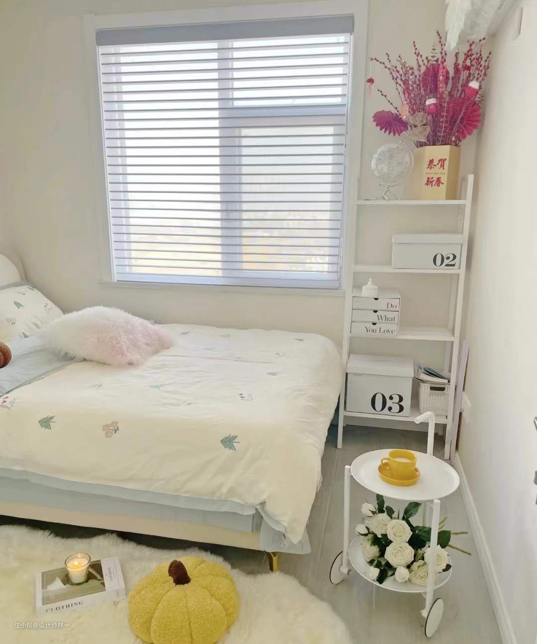 床尾放置了大置物架,搭配收纳盒,极大地增加了小房间的储物收纳空间。
