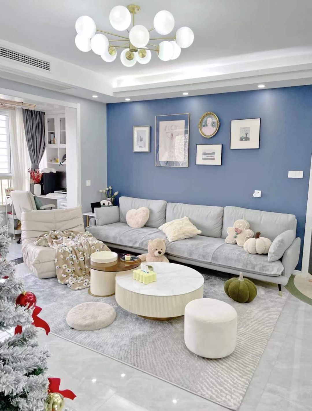 全屋墙布,大部分都是灰色的,沙发背景墙的颜色是水洗蓝,给人一种和平宁静的感觉,让人感到舒服,使用直排沙发,在视觉上感觉客厅大了不少,布局更能节省空间,小朋友的完了空间也大了不少,给人温馨的感觉,适合营造亲密的氛围。