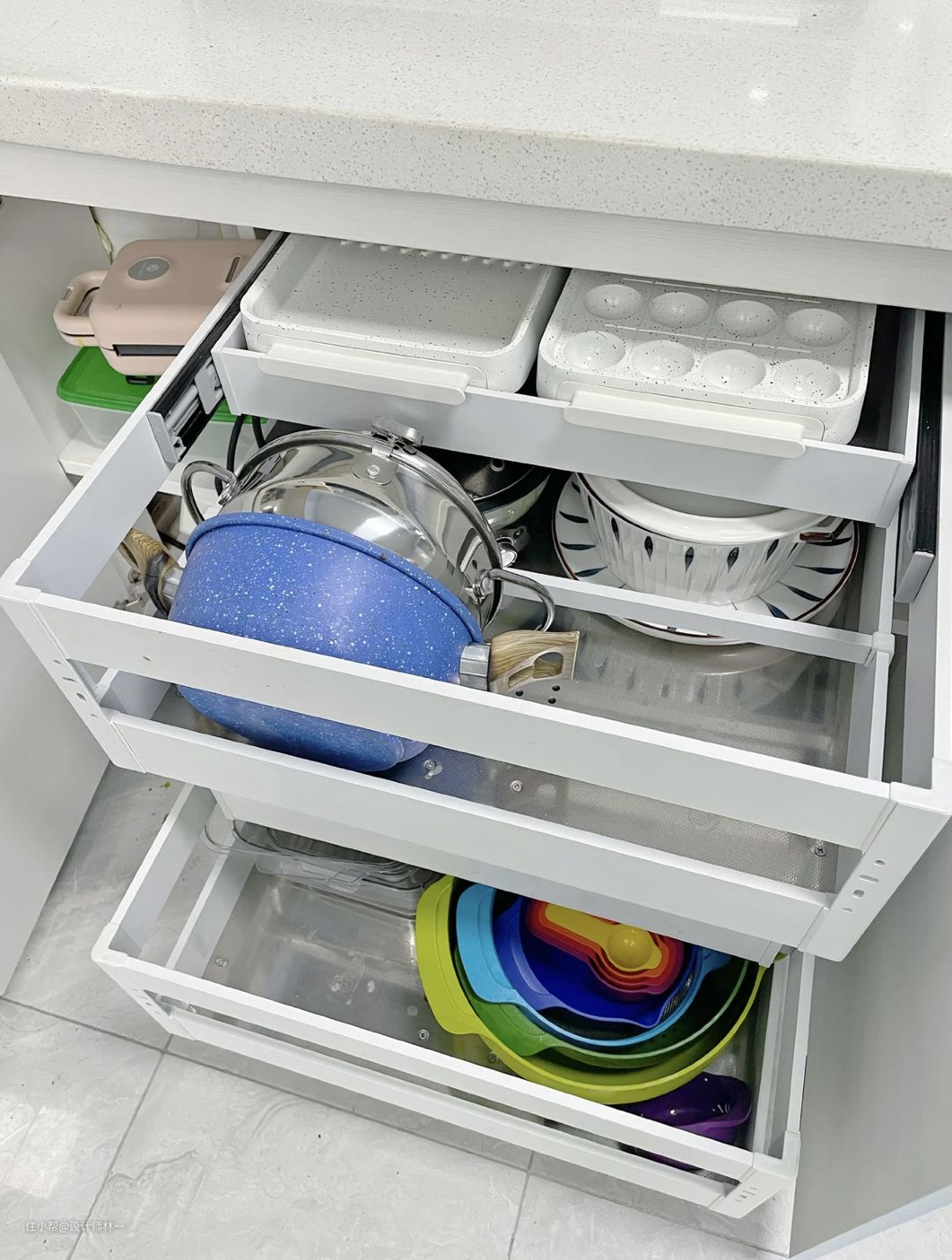 橱柜做了抽拉式,有四层空间可收纳,极大的储物空间,让整个厨房都整洁不少。