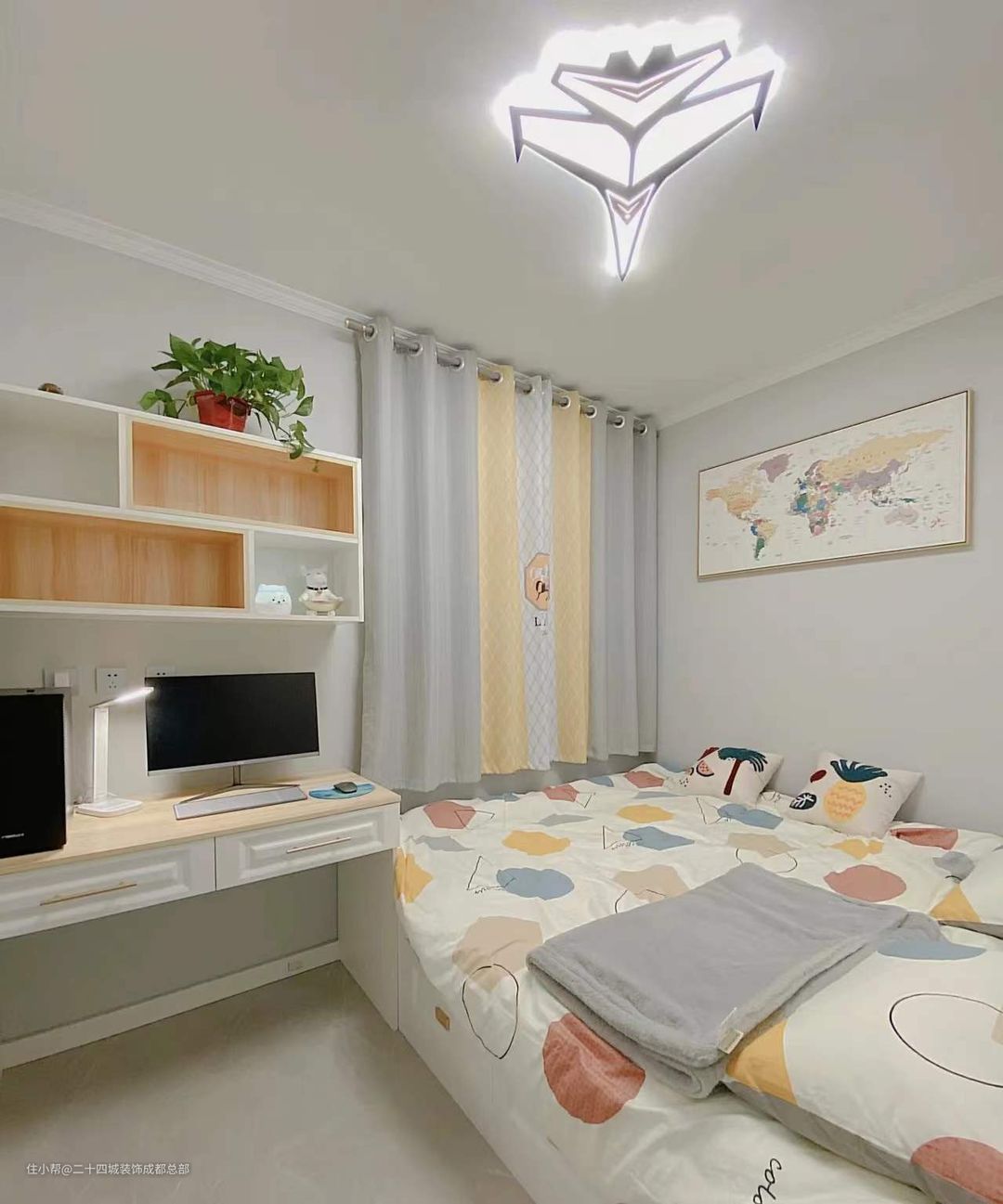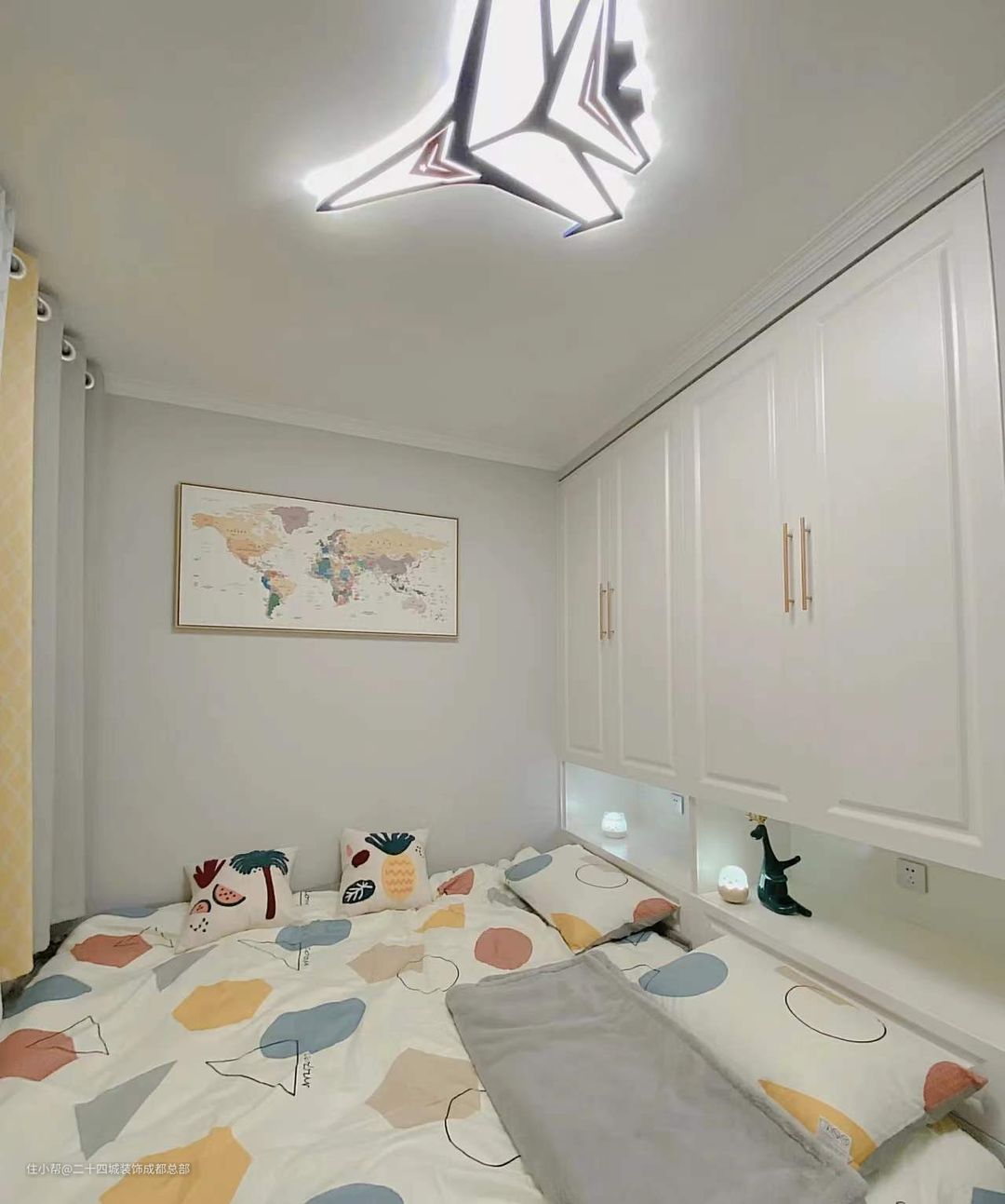 次卧风格偏向男孩,主灯都是战斗机造型的,做了榻榻米设计,在有限的空间里最大可能地提升了空间使用率与实用性,通刷太空漫步色号的乳胶漆,清爽又耐看。