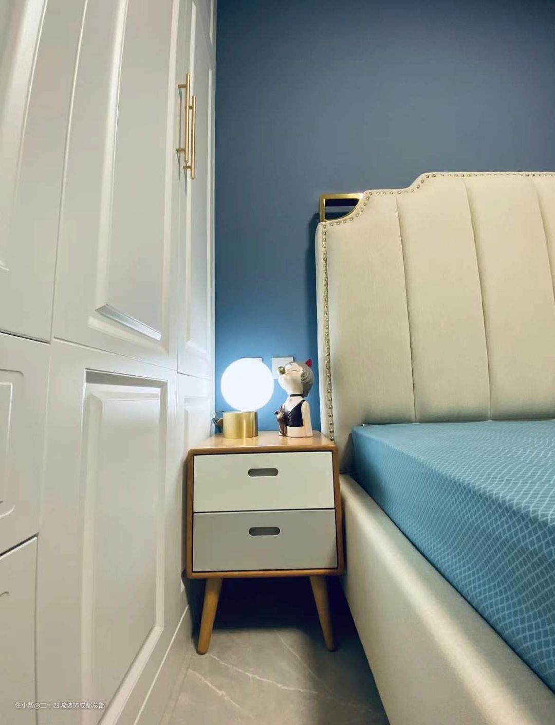 主卧背景墙刷了灰蓝色的乳胶漆,墙面挂了一幅装饰画,不仅烘托温馨舒适的气氛,而且颜值也非常高,增加了生活的趣味性,搭配上定制衣柜的白色柜门,给人一种干净又高级的感觉,金色的把手突出了满满的质感。