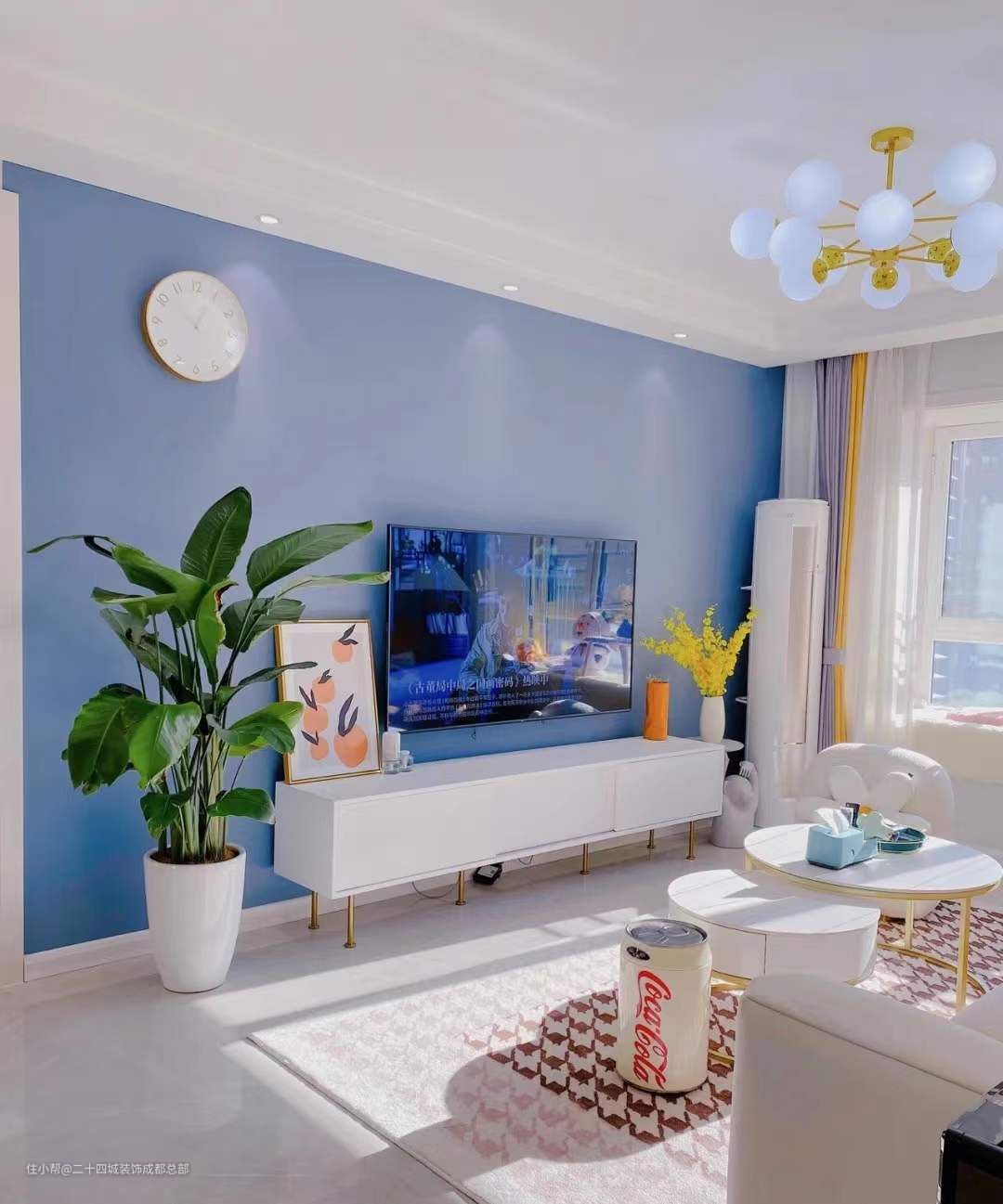 电视背景墙刷了灰蓝色号的乳胶漆,给人的感觉很高级,不是很生硬的蓝色,而是柔和的蓝色,电视柜是纯白色的,2.2m长,简洁颜值高,还为客厅增加了储物空间。
