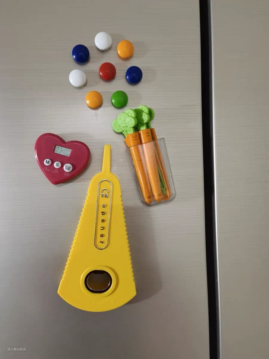 上图冰箱这个黄色的就是买的KM的旋盖小宝,日常开瓶盖还是很不错的,十几块就能买到,解决了女生开盖难的问题。