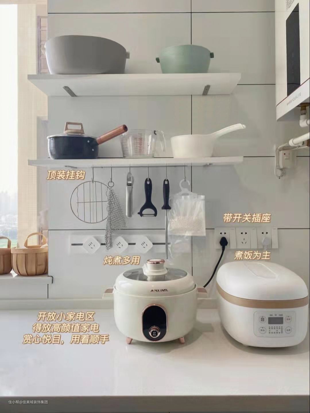 L型的短边是小家电区,开放搁板放洗菜盆和小锅,台面放常用的小家电,如电压力锅,电磁炉...