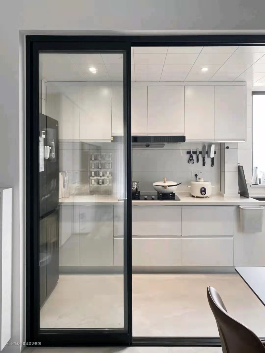 扩大后很细长,做了橱柜剩1m宽走道,因此设计了大半窗和2.8m推拉门,大面积玻璃更通透,降低空间压抑感