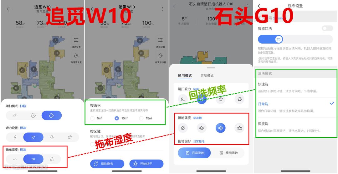 但看物理参数,追觅 W10的清水箱容量要略大于石头 G10。但由于两者拖布形式不同,工作时的耗水量也存在差异,因此水箱容量的大小并不能直接代表两者的续航能力差异。