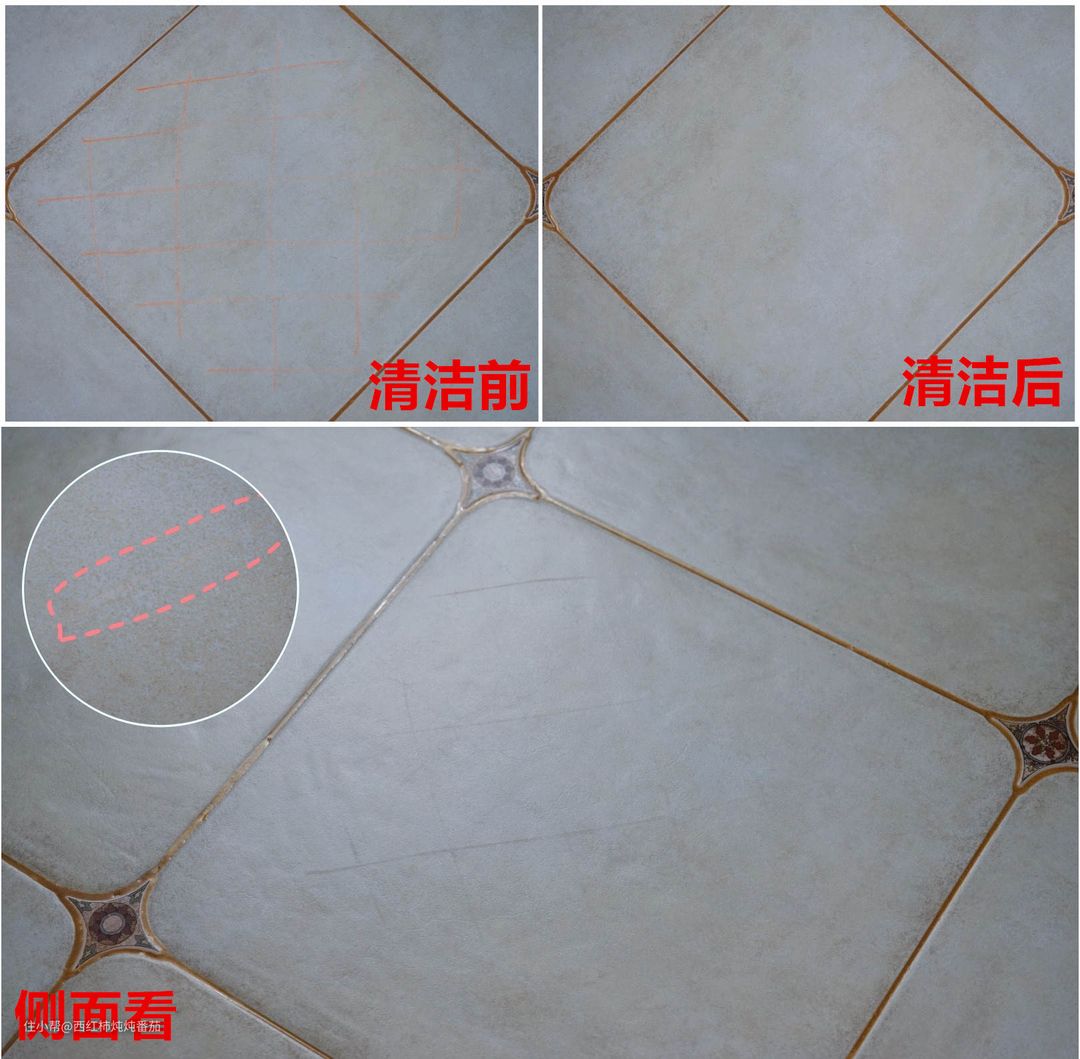 对比清洁前后照片,站立姿势下俯视,地面记号笔痕迹被彻底清除,细看也完全找不到一丝痕迹。不过从侧面观察,只要找到合适的角度,也是可以看到瓷砖上还有轻微划痕 ▲