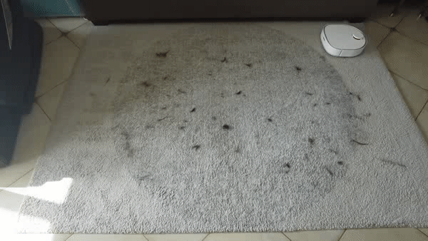 首先将上一次测试残留的头发用吸尘器清洁干净(吸尘器和扫地机真的属于两个品类,未来最有可能取代吸尘器的是洗地机),然后再随机在地毯上撒上头发碎末如上 ▲