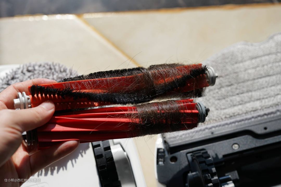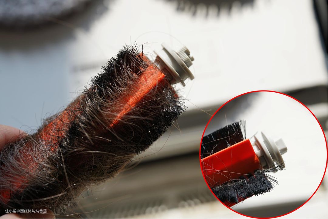首先分别取两缕重约 2g的头发,均匀洒在房间各个位置,接着先后启动两台扫地机,在完成清扫任务后,查看主刷上的毛发缠绕情况,对比如下: