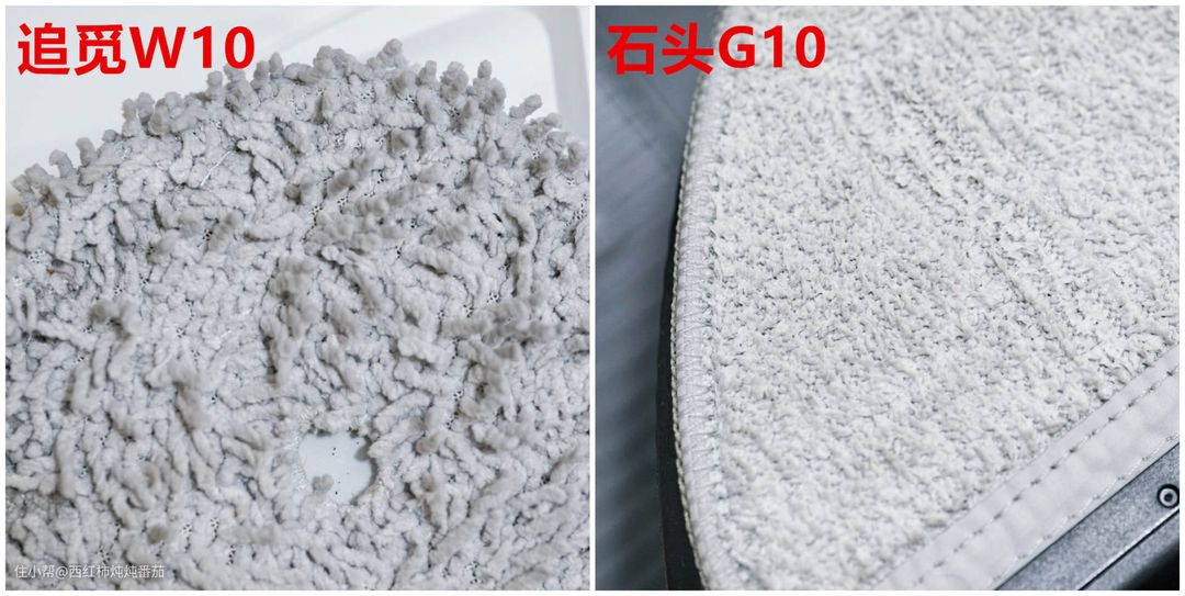 可以看到,追觅W10采用的旋转拖布有着极大的“纵深”,一看就有着很强的“藏污纳垢”的能力;而饭馆石头 G10的拖布,绒毛长度则要短了很多 ▲