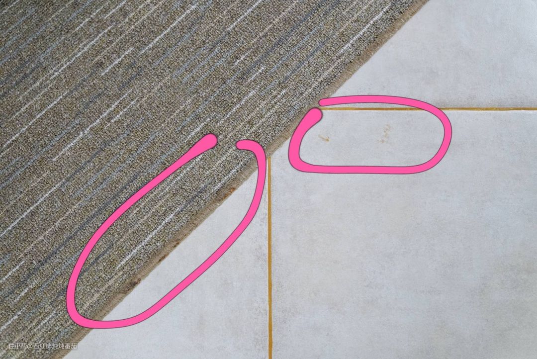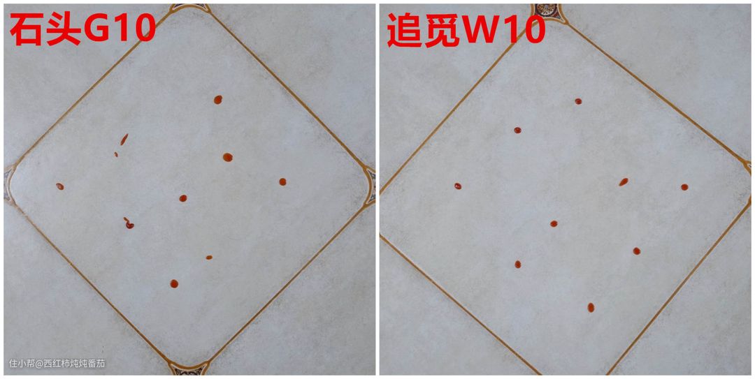 很快楼主就发现了问题:虽然在视频中,石头 G10也将瓷砖上的番茄酱完全清洁干净了,但就在距离测试区域不远的入户区域,楼主发现了扩散的污渍。而同样的测试中,追觅 W10则没有遇到这样的问题 ▲