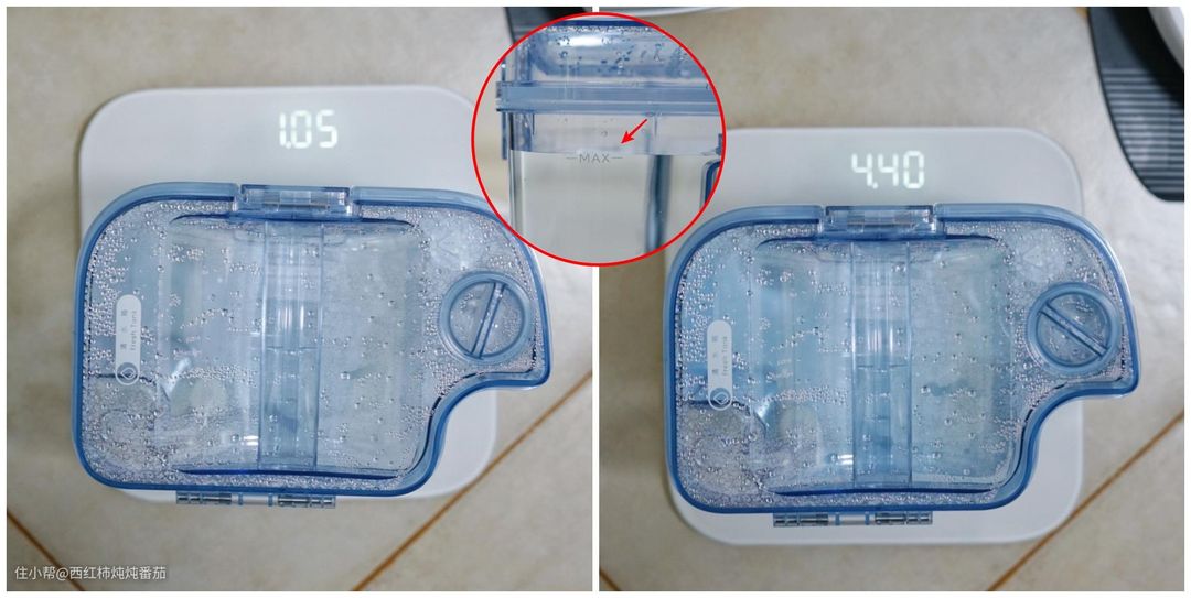 我们先后测量空净水箱的重量以及装满水后的清水箱重量,可以大致估算出追觅 W10净水箱的容积大约在 4.40-1.05=3.35L ▲