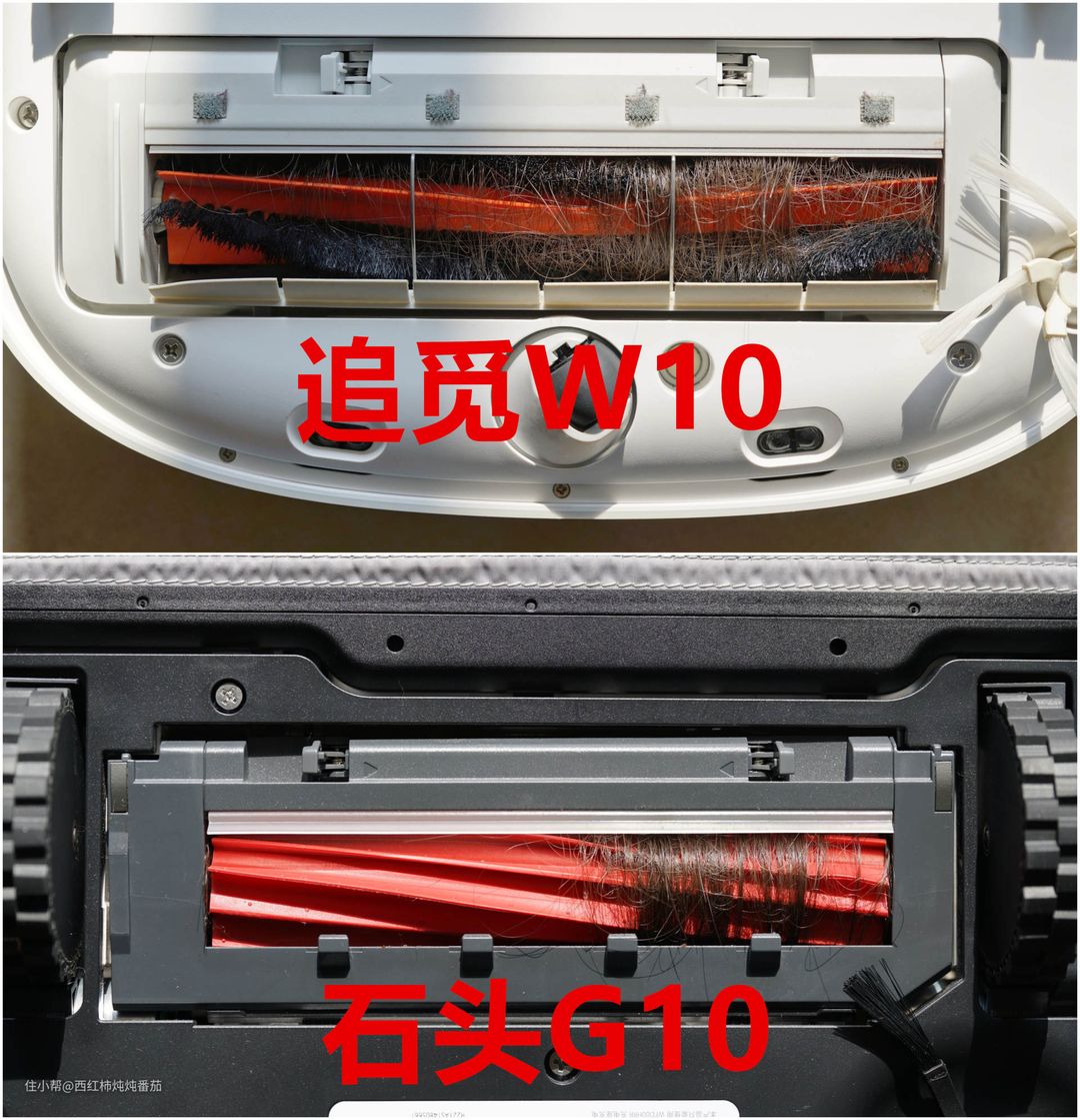 在材质方面,追觅 W10采用的是胶条和毛刷交替的“V字型”方案;而石头 G10则采用了纯胶条设计。这种主刷设计方面的差异就在理论上导致追觅清洁能力更强,而石头则更不容易缠绕毛发。