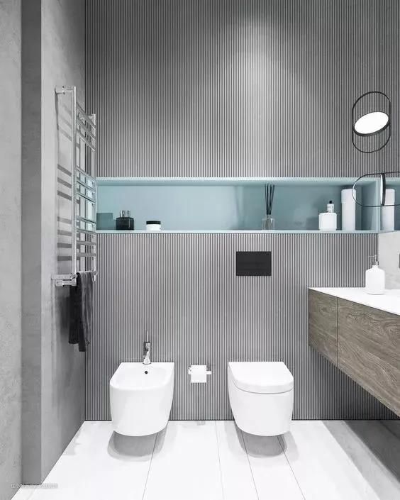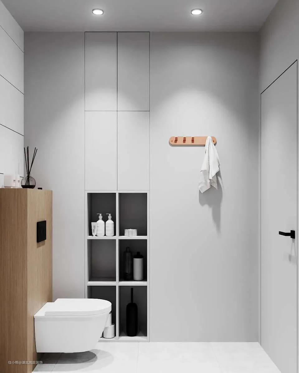 卫生间容易出现不规则空间,比如夹缝位置,这里可以采用搁板,做成壁龛的形式,顺手取放更方便。