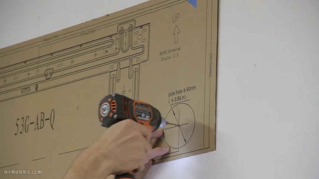 安装师傅把挂板怼墙上一比划,就能大概确定外墙打洞的位置。