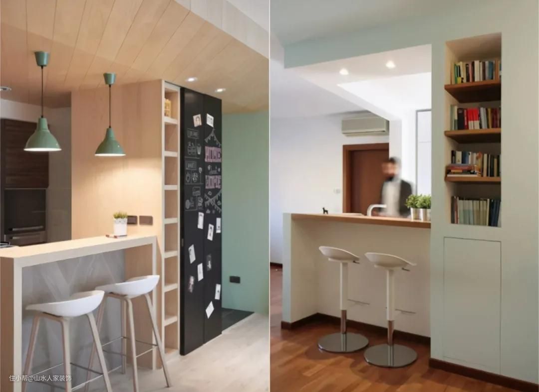 这样的设计功能多用,可以帮你省下一张餐桌钱。吧台分割了厨房跟餐厅,摆上几把高脚餐椅就变成了餐桌。吧台下面做收纳,不常用的大件锅具都可以放里面,拿取也方便。和家人在吧台聊天包饺子,都不错。不过吧台的大小需考虑家里的实际使用面积,35平米以下的户型建议不用了。